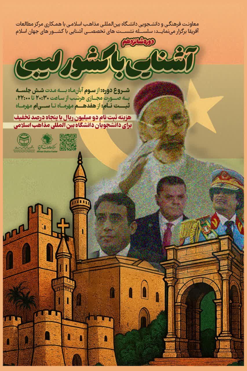 سلسله نشستهای مجازی تخصصی آشنایی با کشورهای اسلامی دوره شانزدهم: آشنایی با کشور لیبی همراه با اعطای گواهی حضور ثبت نام از: ۱۶ تا ۳۰ مهرماه شروع دوره از ۳ آبانماه